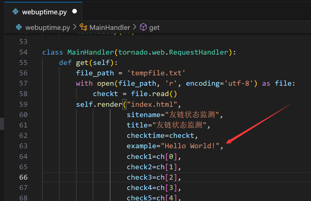 然后在Python脚本里的self.render()函数加上这个参数,等号左边为在html模板中定义的变量,右边为在Python脚本里定义的变量或字符串